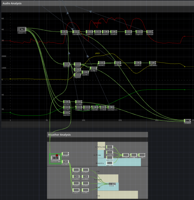 Weather API + Audio Stream → Data Filters → TD Particle Engine → Feedback + FX → Final Visual Output