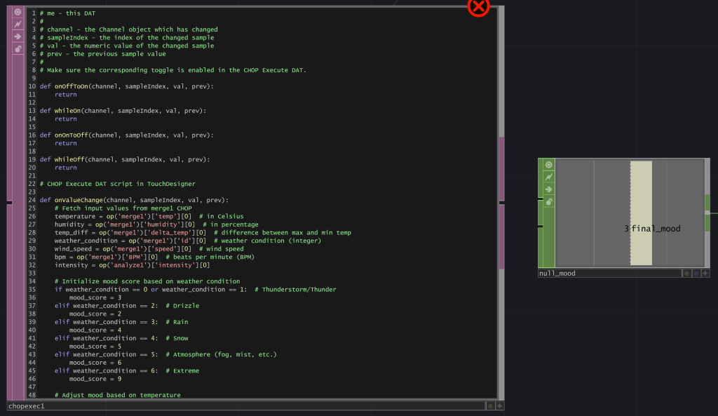 This system serves as a prototype for emotionally aware environments—where external weather conditions and internal sonic energy come together to shape ambient visuals in real time. TouchDesigner allowed for deep integration of sound analysis and API-based data parsing, making the final output both technically rich and aesthetically adaptable.