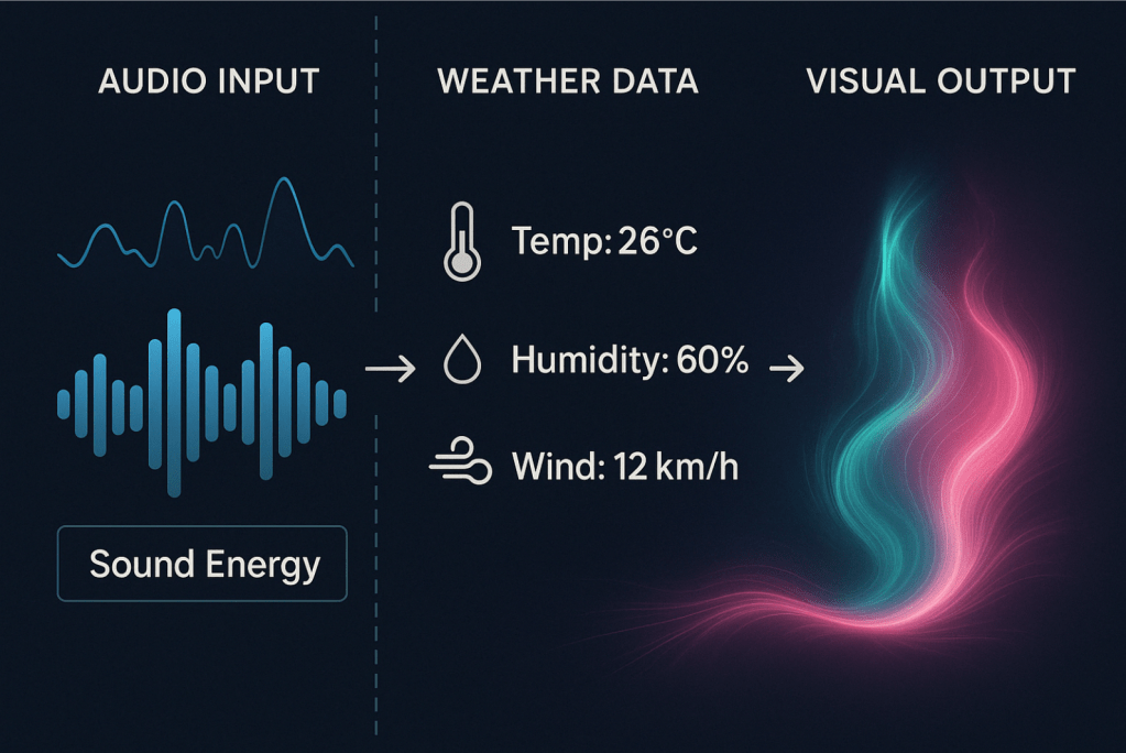 What if your surroundings could feel the temperature of the world outside—and respond with a mood? This project explores how local weather data and audio input can be combined into an ambient visualization system designed to express and mirror emotional tone through visuals. By mapping real-time weather conditions—temperature, humidity, wind—and combining them with audio features like rhythm, pitch, and timbre, I built a system that interprets mood.